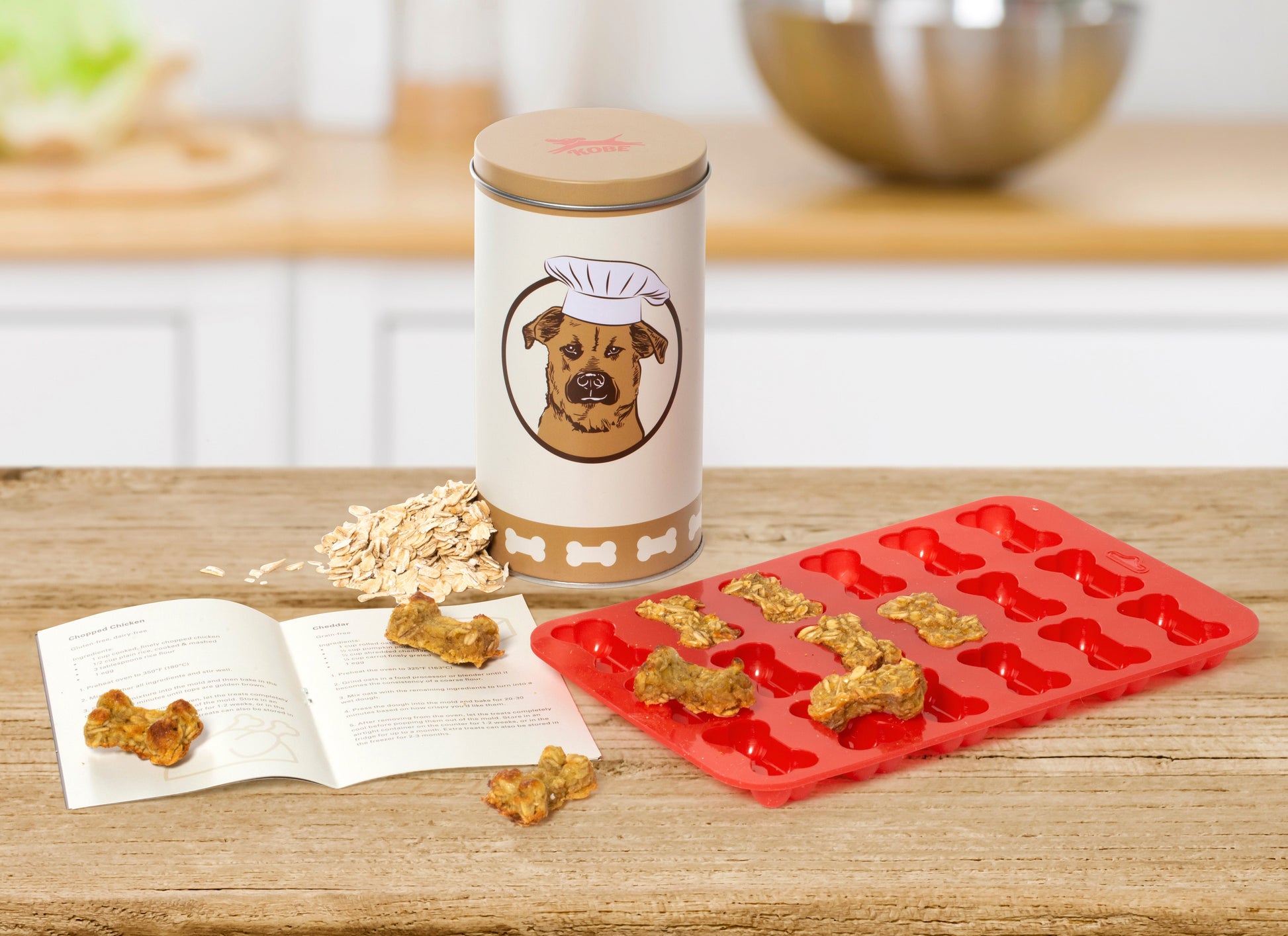 Make your own homemade dog treats! This tin includes a silicone mold that makes 18 treats and a recipe book. Keep the finished treats in this keepsake tin. Silicone mold is dishwasher and oven safe